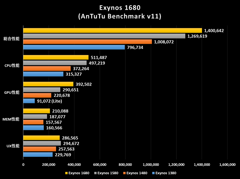 Exynos 1680のAnTuTu v11における性能は、CPU性能が511,487点、GPU性能が392,502点、MEM性能が210,088点、UX性能が286,565点で、総合性能は1,400,642点となりました。