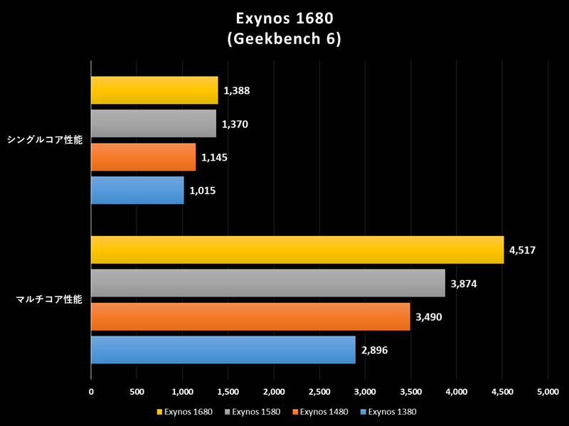 Geekbench 6におけるExynos 1680の性能は、シングルコア性能が1,388点、マルチコア性能が4,517点となりました。Geekbenchでは異なるOSでの比較を認めているので、これを見るのに使用しているデバイスで算出された性能を比較できます。ちなみに、Geekbenchには基準点があり、IntelのCore i3-8100が算出するシングルコア性能が1,000点に設定されています。