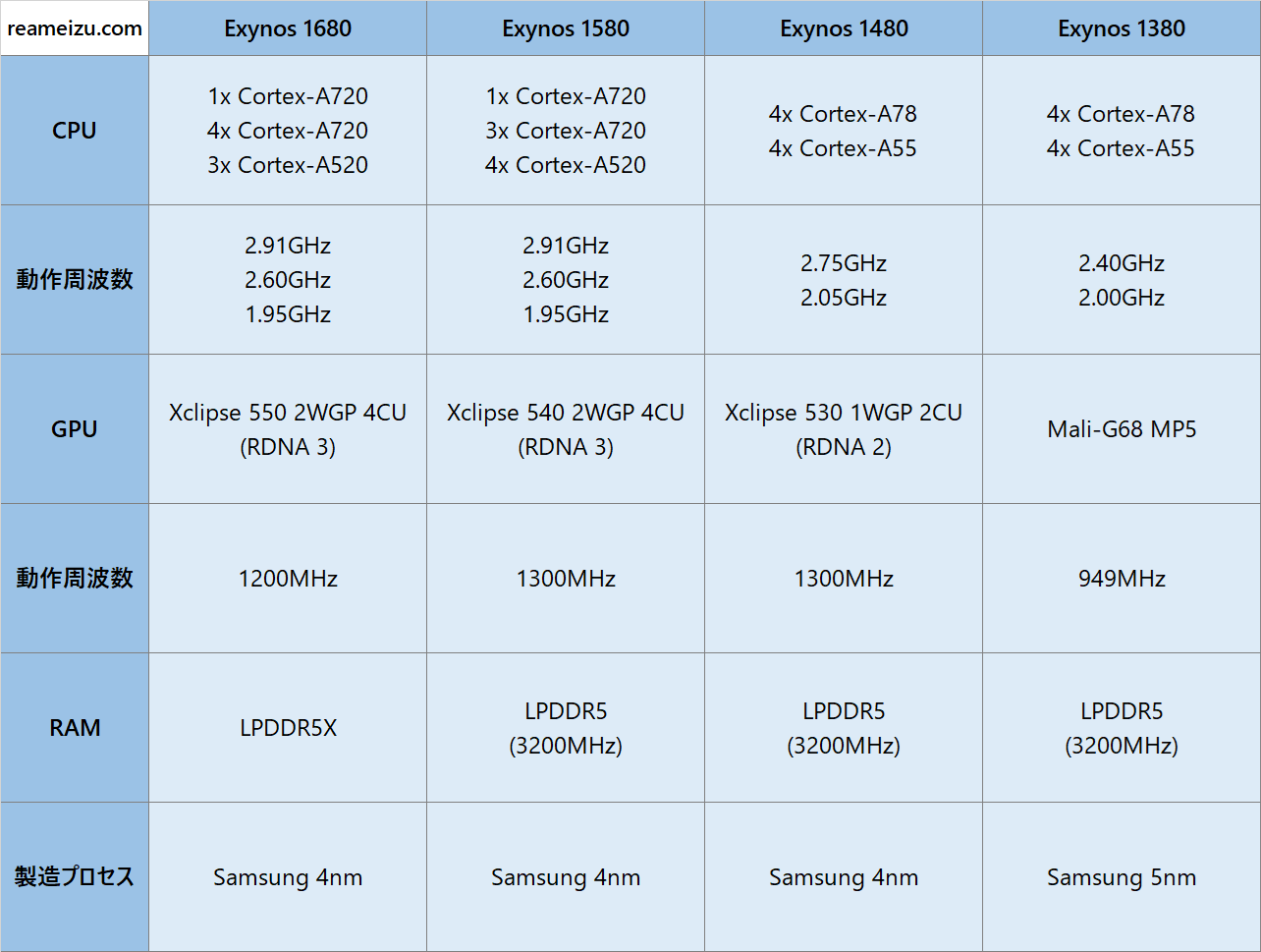 Exynos 1580との違いは、CPUとGPUとRAMにあります。CPUは高性能なCortex-A720が1基増えて、高効率なCortex-A520が1基減りました。GPUは2WGP 4CUで見た目は同じですが、Render Blockが1から2へ倍増しました。RAMは最新の規格のLPDDR5Xをサポートしますがデータ転送速度は不明で、標準的な4200MHzなのかUltra表記がされる4800MHzなのか、はたまた最上位のUltra Proと表記される5300MHzなのかわかっていません。